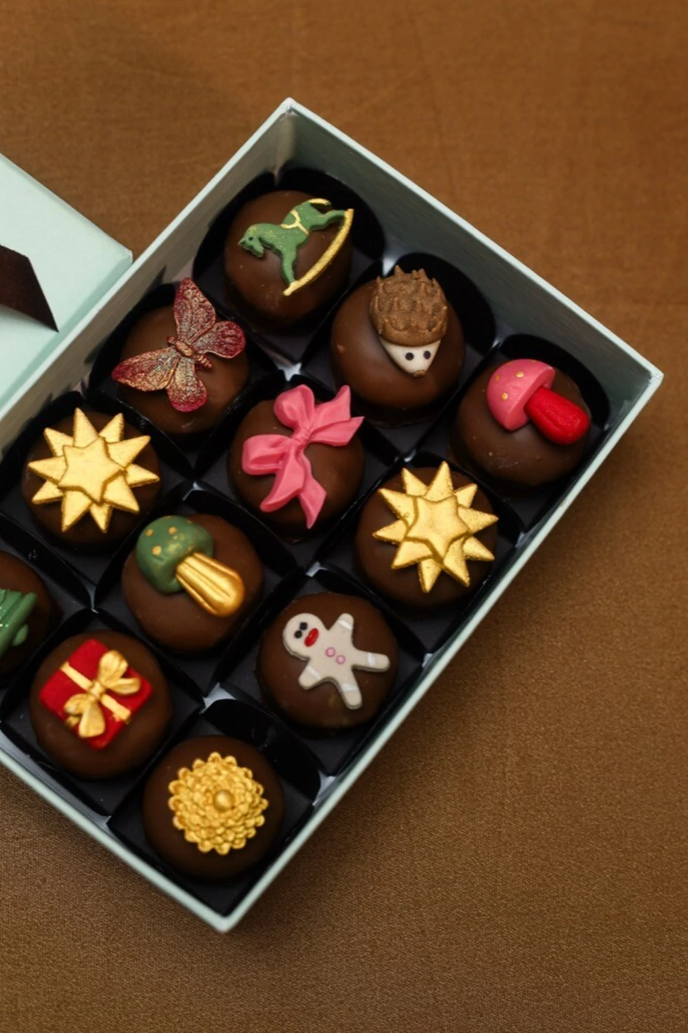 -Caixa Le Gastronomia com 12 Pães de Mel Mini com recheio de Doce de Leite ou Brigadeiro e cobertura de Chocolate ao Leite ou Branco, com Enfeites de Natal sortidos.