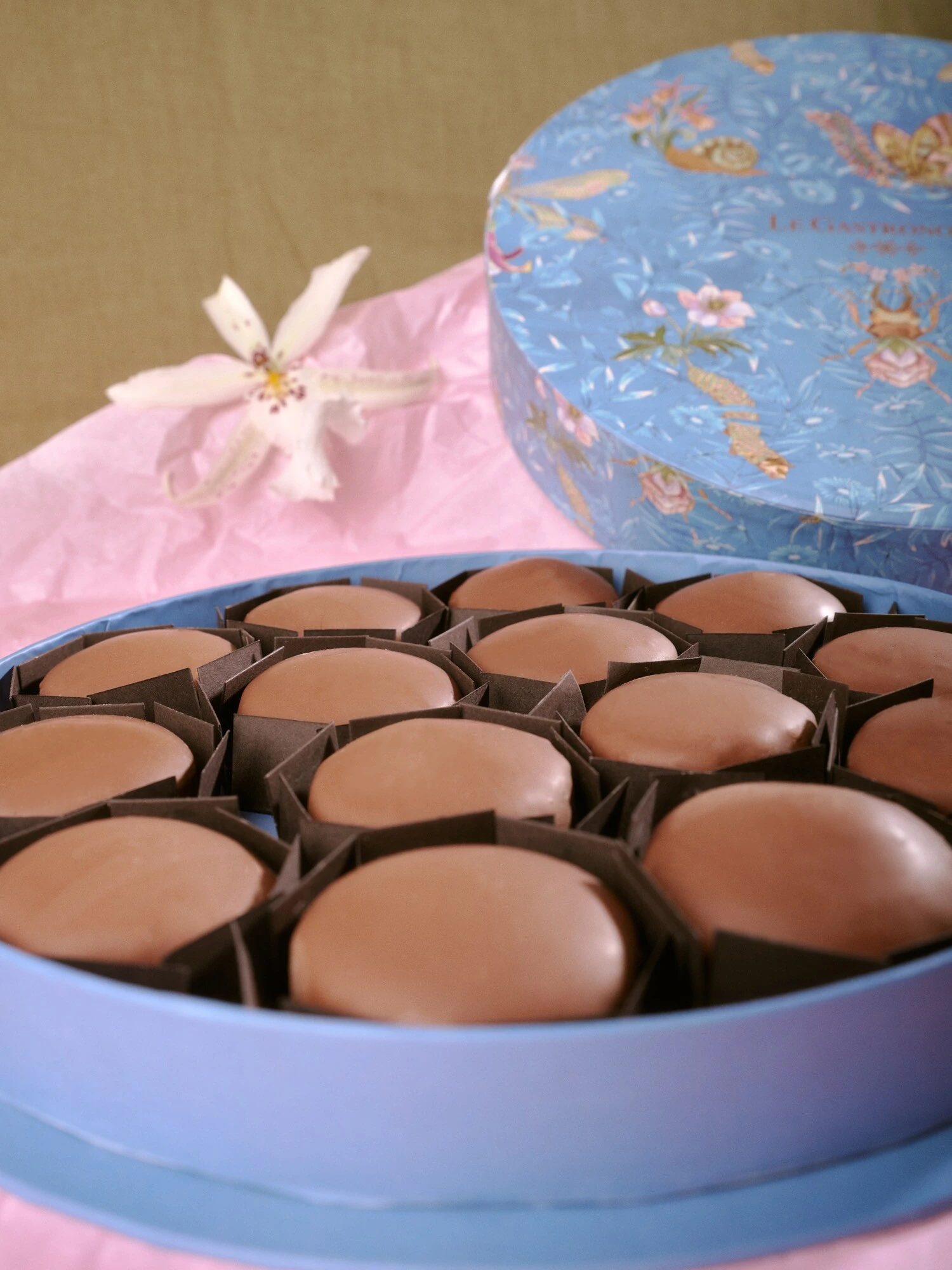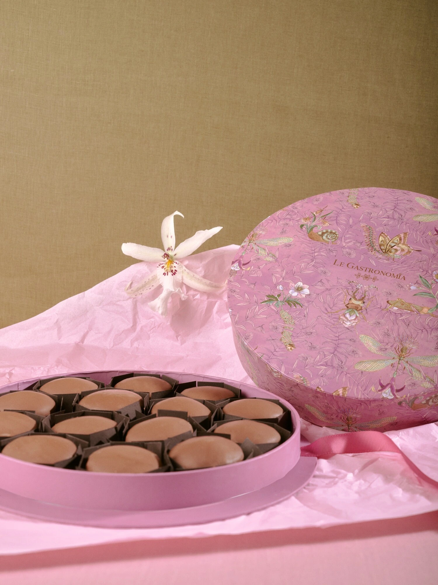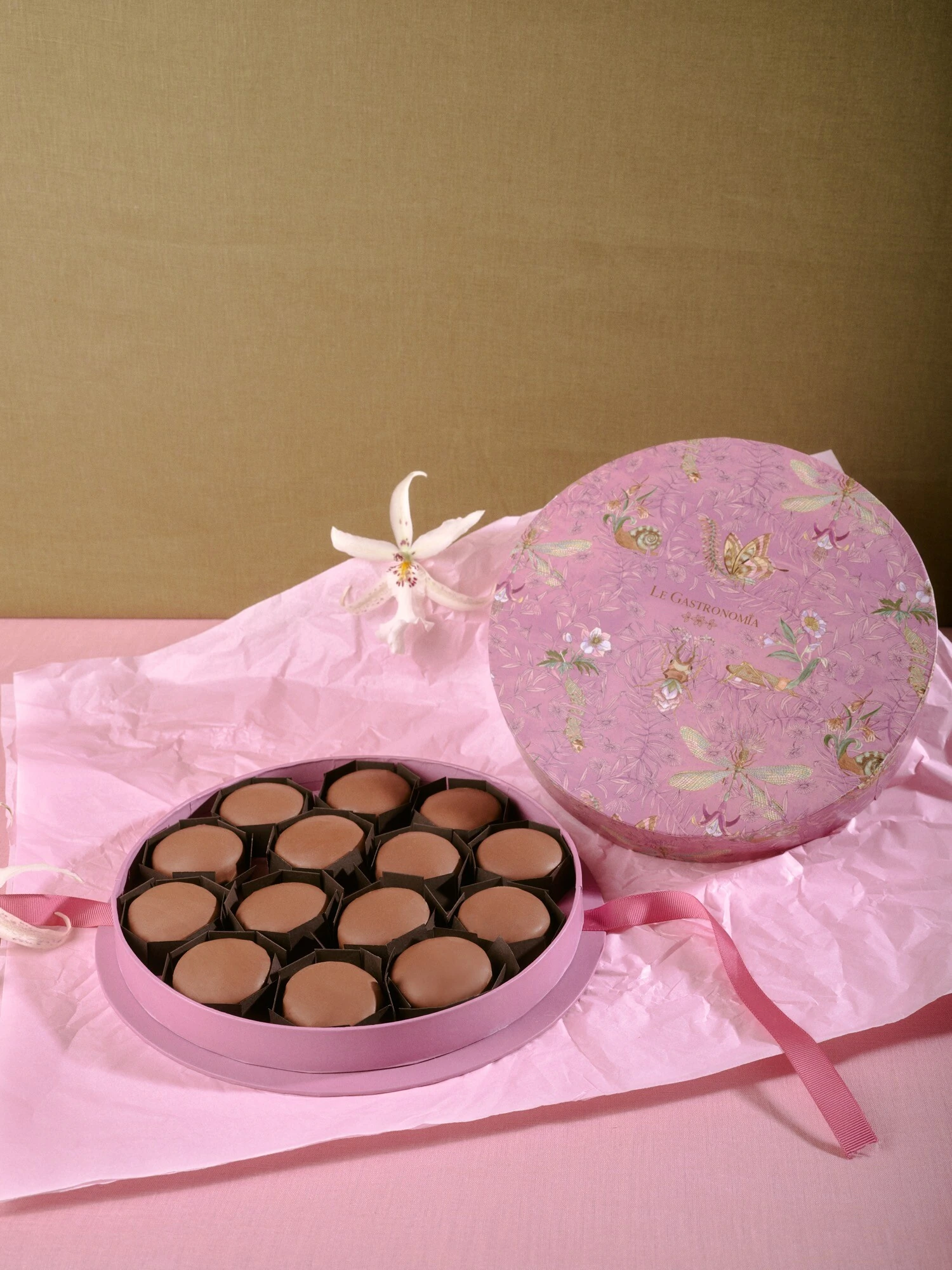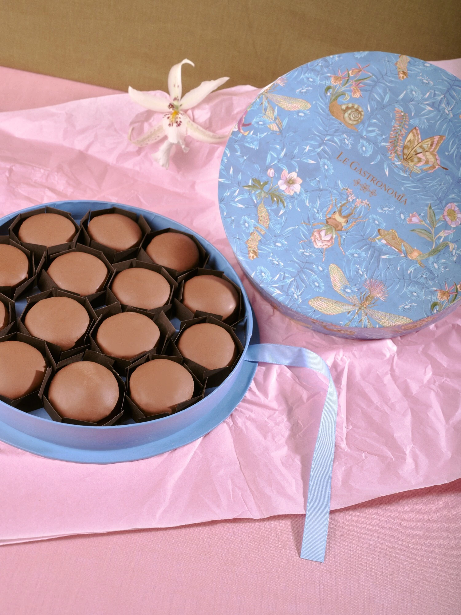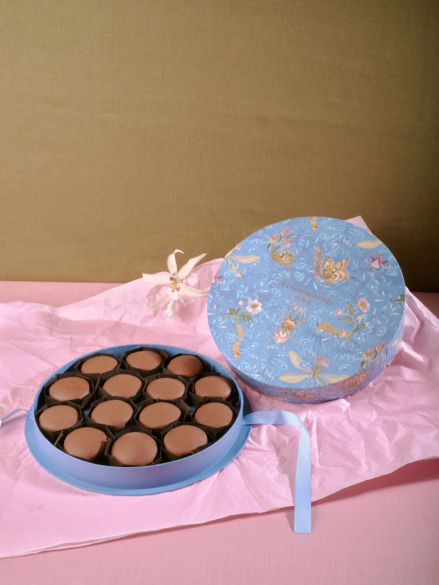 Caixa Redonda Bichos Azul, Rosa ou Verde (sem opção de escolha) com 14 Pães de Mel Tradicionais com Recheio de Doce de Leite e Cobertura de Chocolate ao Leite ou Recheio de Brigadeiro e cobertura de Chocolate Branco.