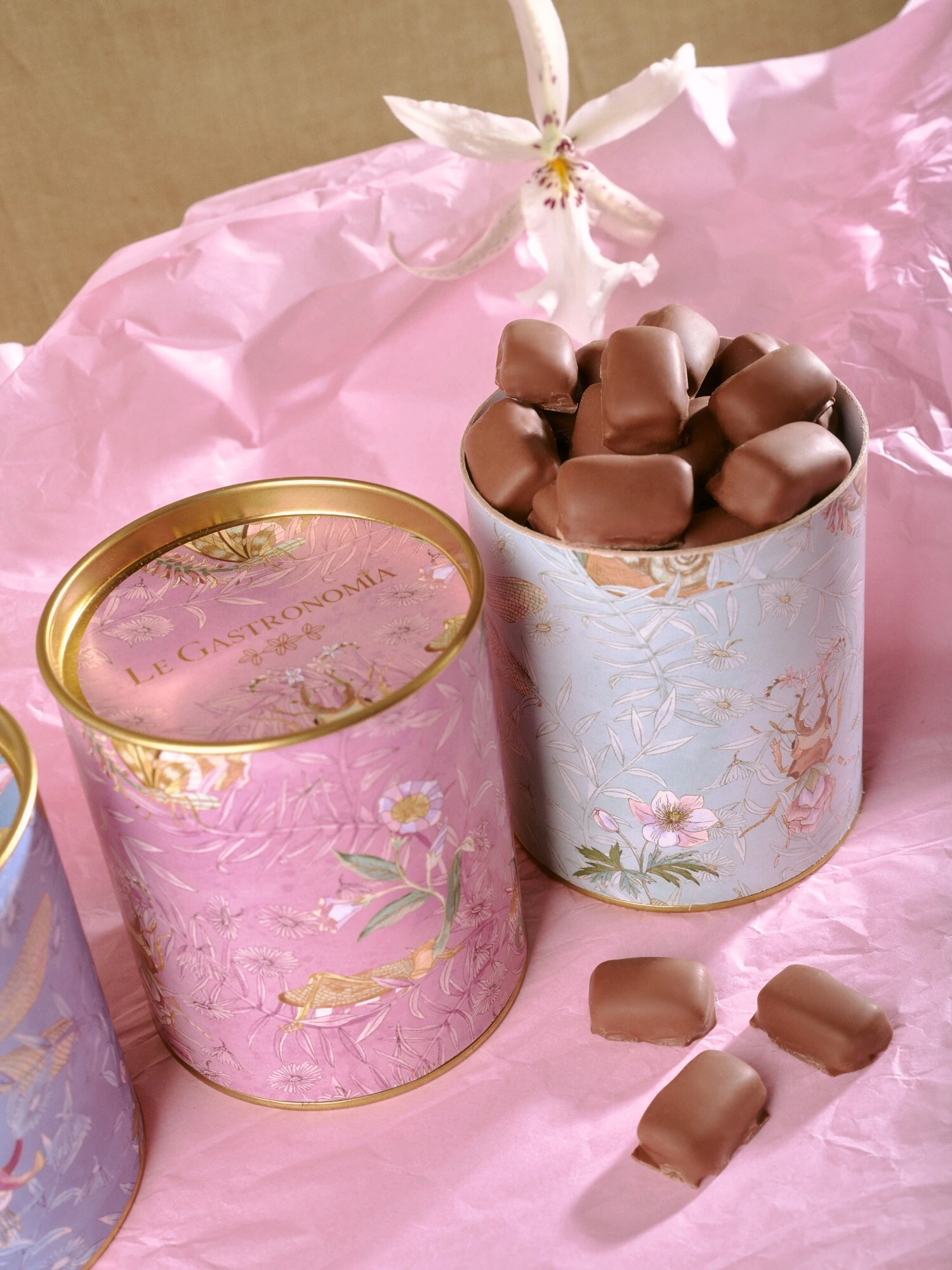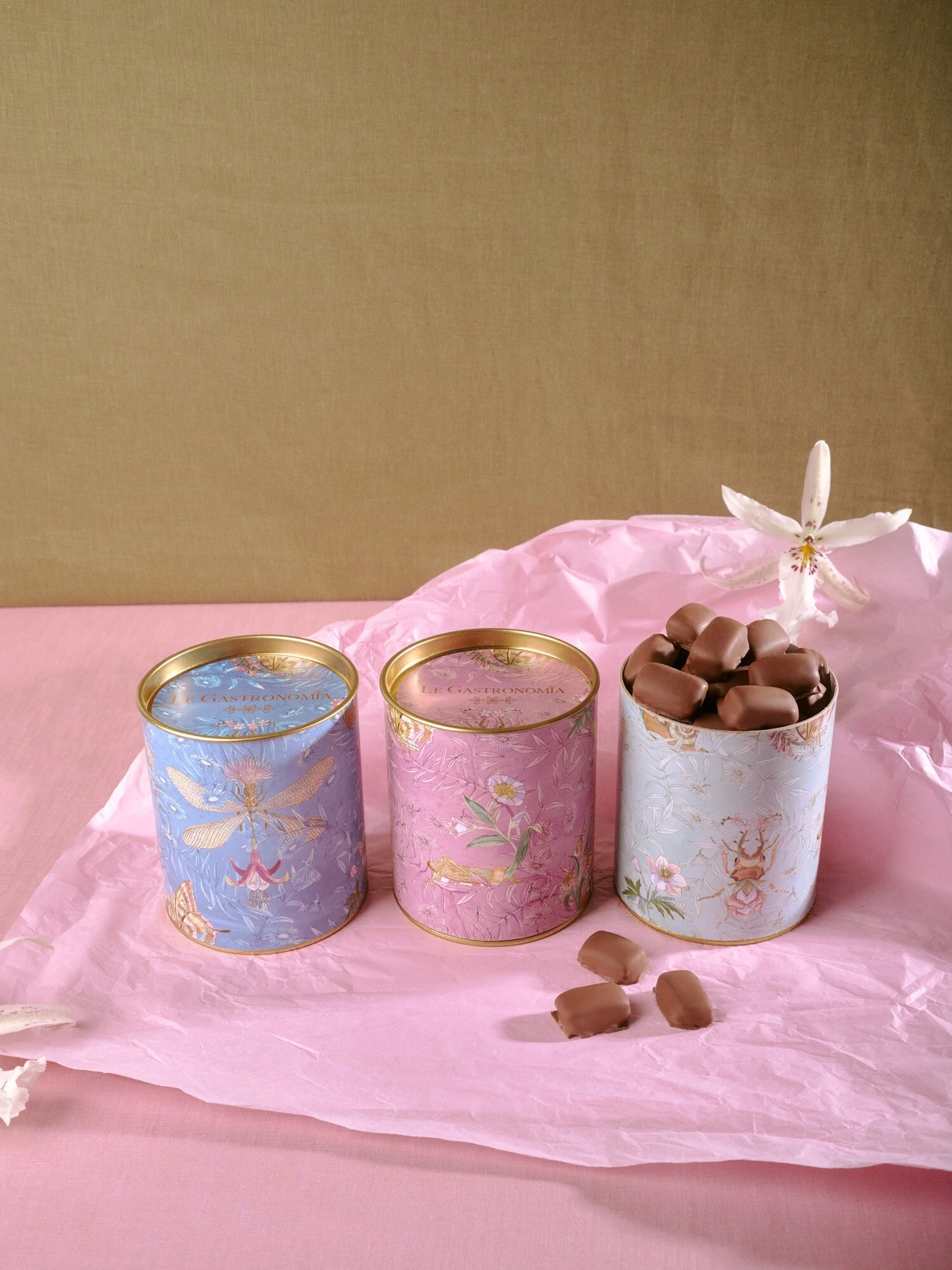 Lata Bichos Rosa, Azul ou Verde (sem opção de escolha) com 30 Balas de Pão de Mel Mistas de Chocolate ao Leite e recheio de Doce de Leite, embrulhadas no celofane transparente