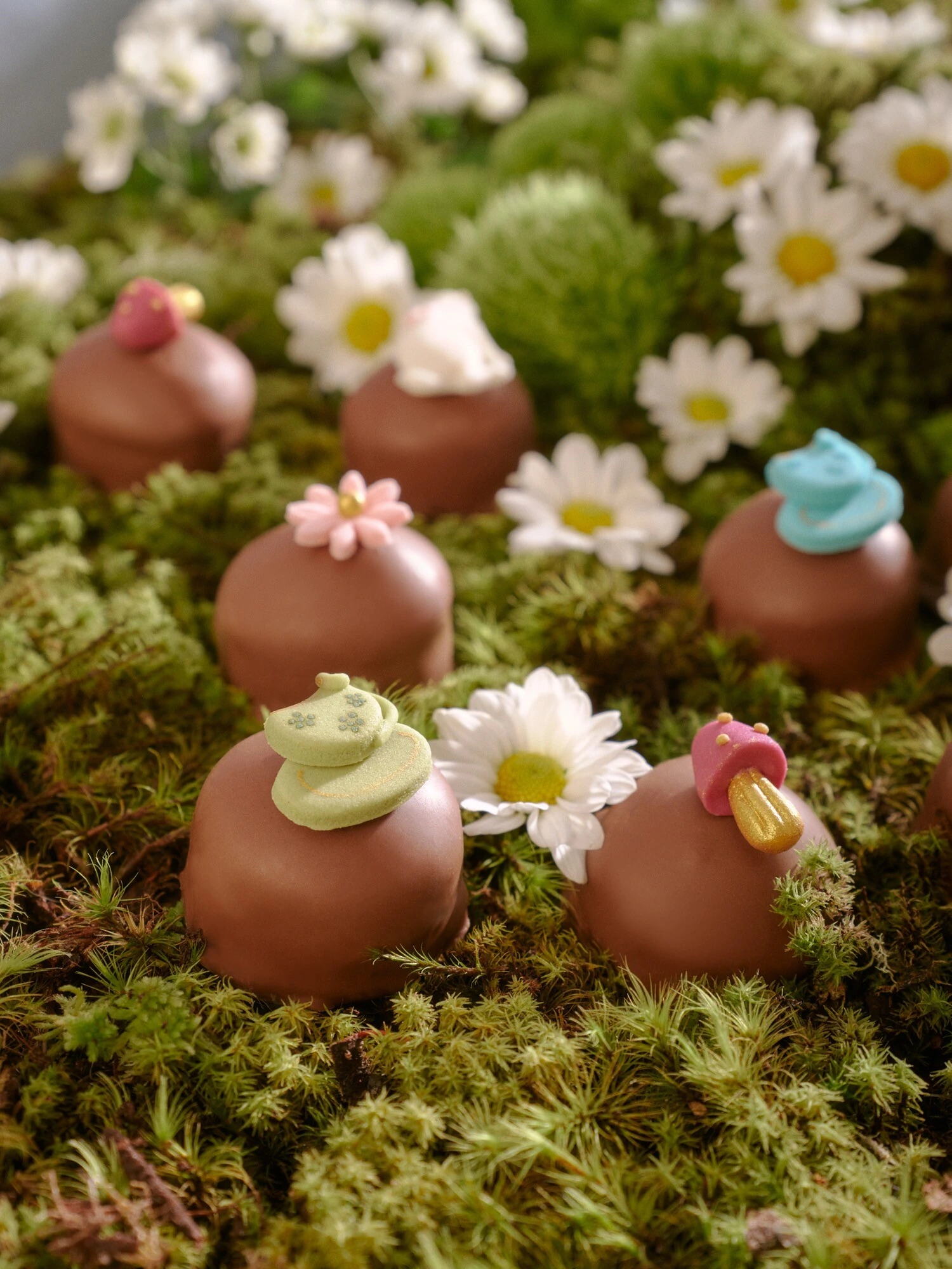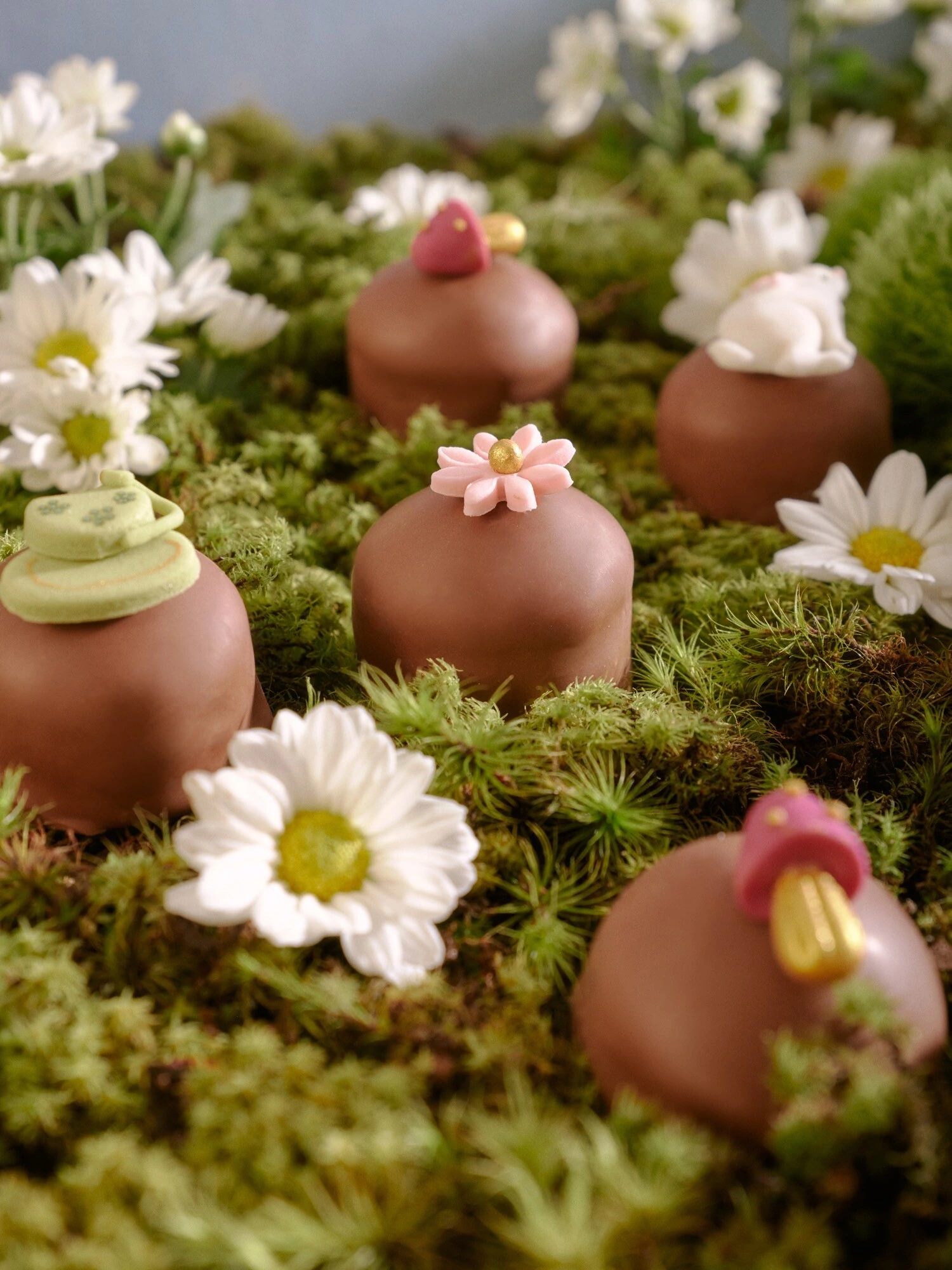 Pão de Mel Mini com cobertura de Chocolate ao Leite e recheio de Doce de Leite ou Chocolate Branco e recheio de Brigadeiro com Aplique de Páscoa sortido