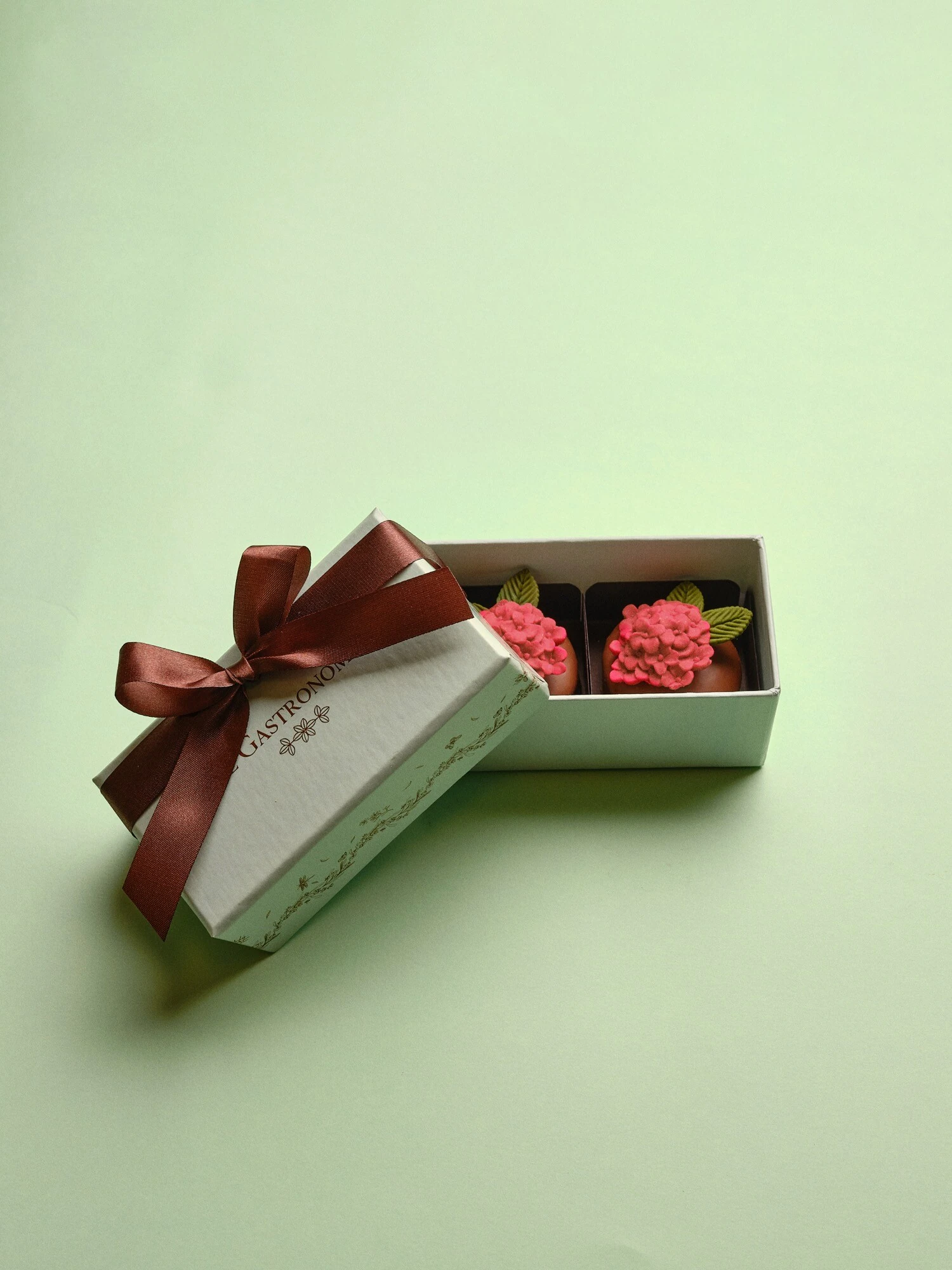 Caixa Le Gastronomia com Fita Marrom e com 2 Pães de Mel Tradicionais com Recheio de Doce de Leite e cobertura de Chocolate ao Leite OU Recheio de Brigadeiro e cobertura de Chocolate Branco e Aplique de Flor 3D.