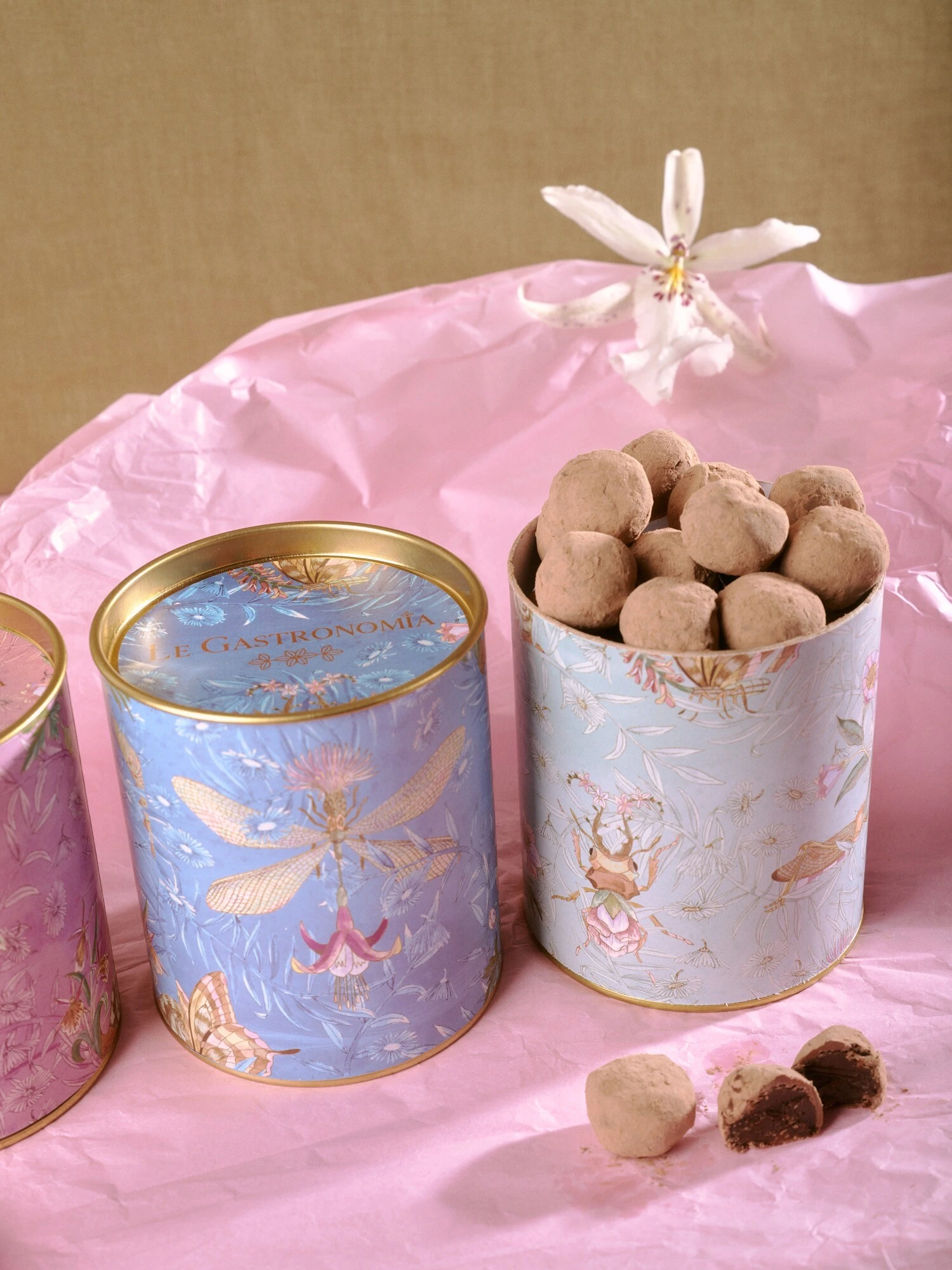 Lata Bichos Rosa, Azul ou Verde (sem opção de escolha) com 16 Trufas de Chocolate Amargo, embrulhados no celofane transparente como bala