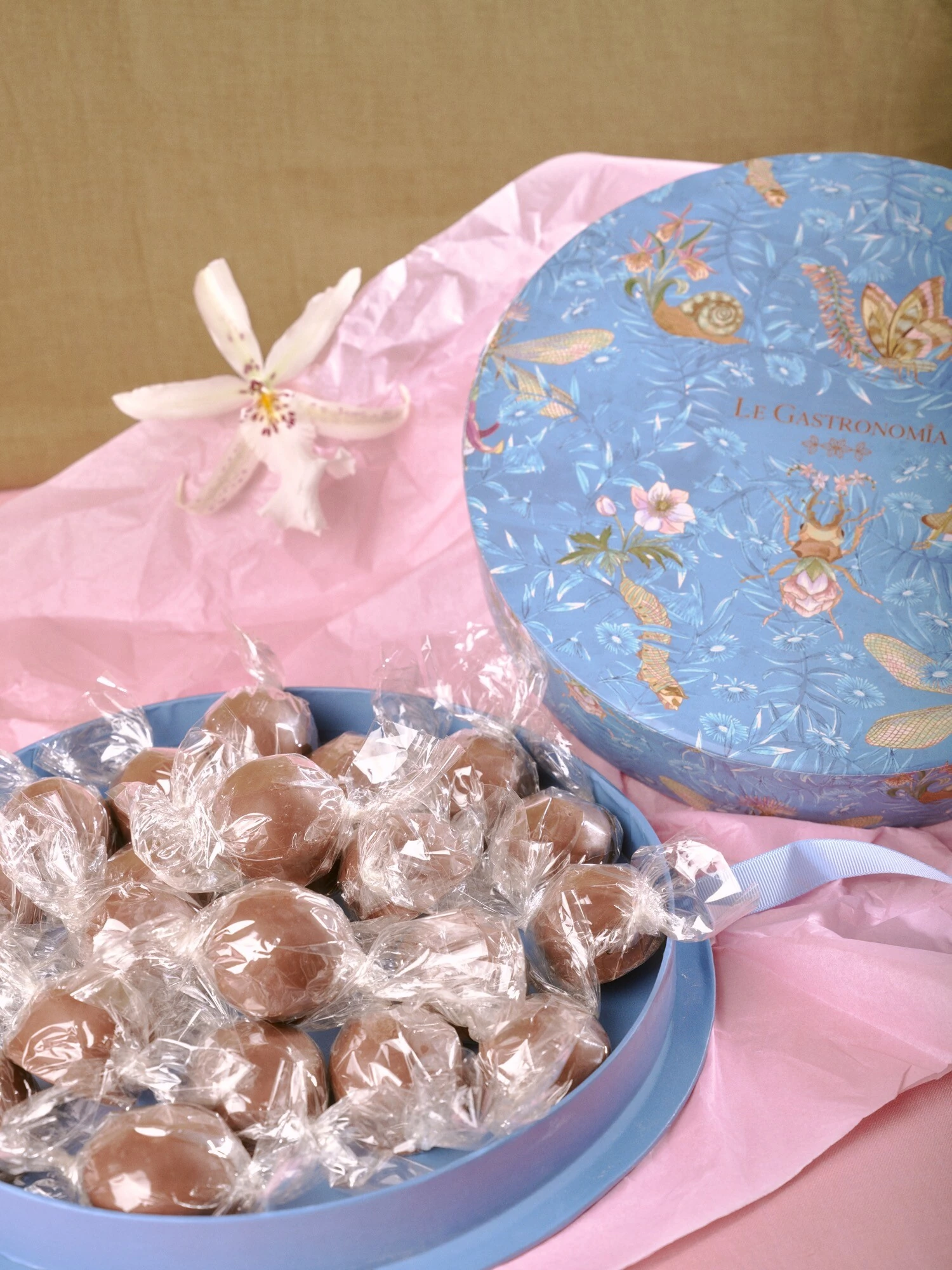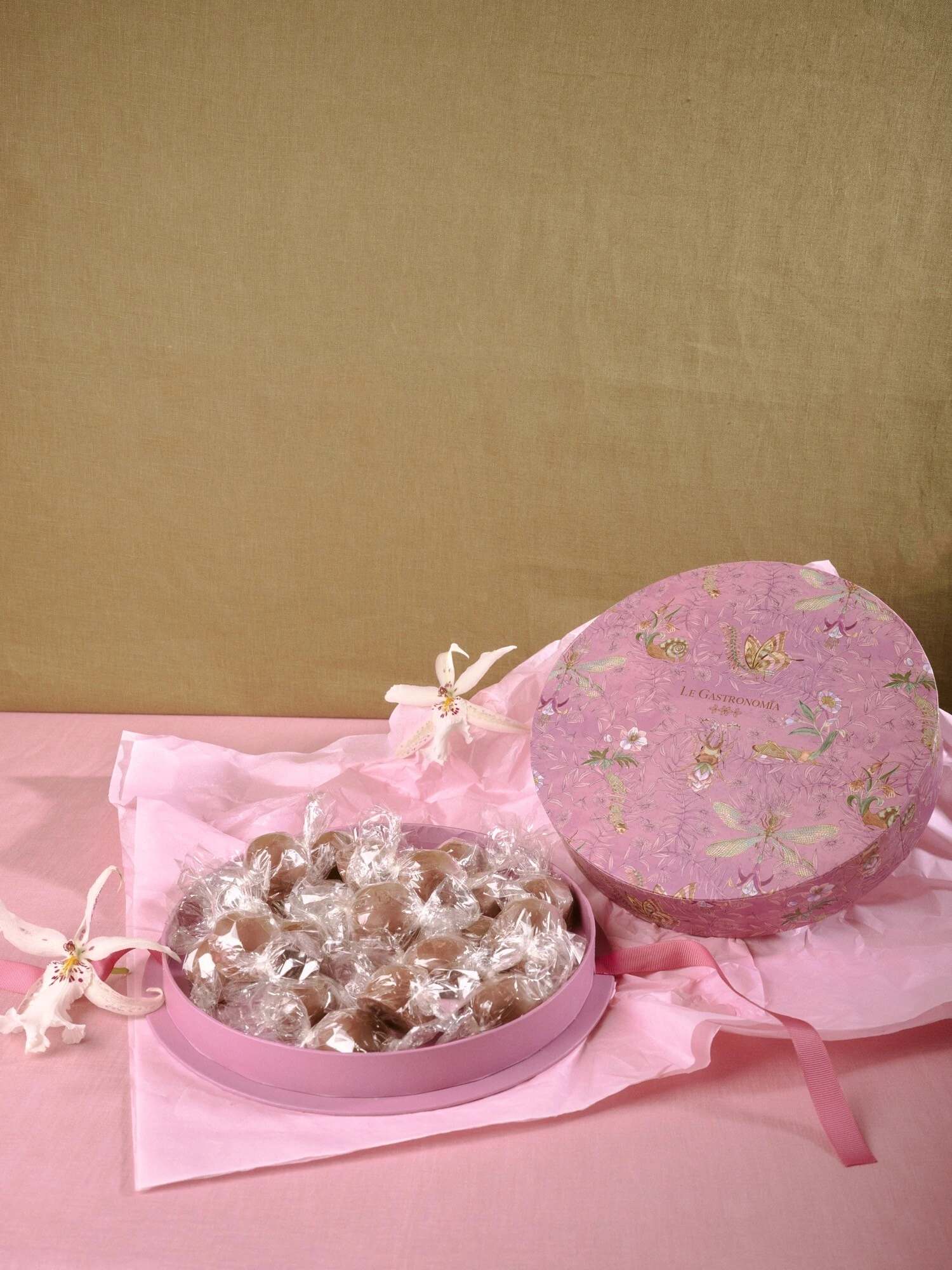 Caixa redonda Bichos Azul, Rosa ou Verde (sem opção de escolha) com 24 mini pães de mel com recheio de doce de leite e cobertura de chocolate ao leite, embrulhado no celofane como bala