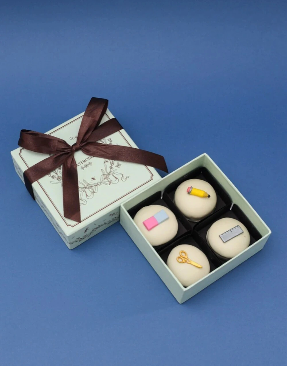 Caixa Le Gastronomia com 4 Pães de Mel Tradicional coberto com chocolate ao leite e recheio Doce de Leite ou chocolate branco e recheio Brigadeiro, com plaquinhas de Dia dos Professores (sortidas).